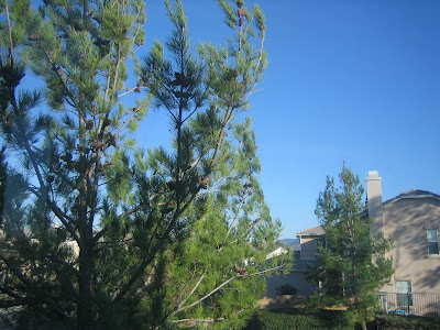I took the picture above on a pristine, blue-sky day last fall -- a day a lot like today. This is the view looking east out the upstairs stairway windows. It was breezy out then, but then it's often breezy around these parts. It's the second week of October, and still 88 degrees out. I'm about over that, but such is life in Southern California -- and the Inland Empire region, at that. I'm all ready for cold days and crisp nights and trying out some flannel sheets and baking a cake to go with the Maple Pumpkin Butter I bought a few weeks back. Ready to wear long sleeves, and socks, and let that deep flip-flop tan on my brown summer feet finally fade away. Maybe next week?